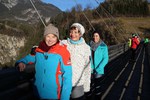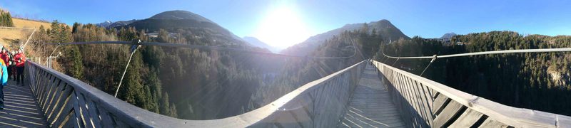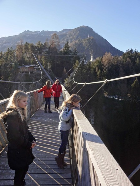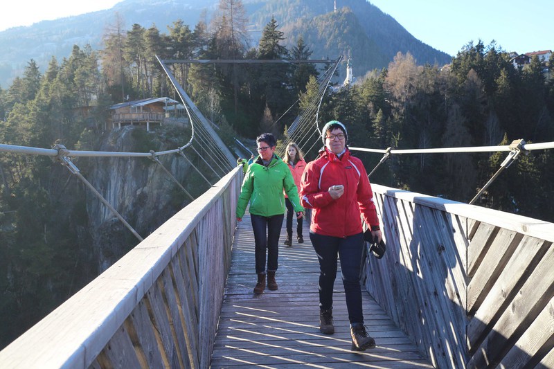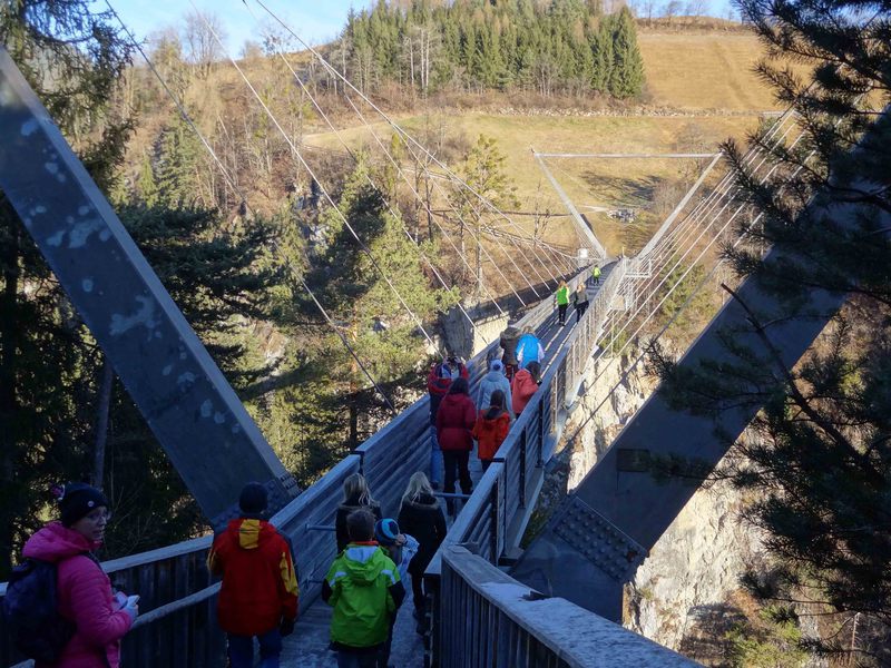 Nach der sehr gelungenen Ausfahrt im letzten Jahr, haben sich auf Empfehlung wesentlich mehr Skifan´s angemeldet. Leider konnten wir nicht alle unterbringen. Schade für alle die nicht mit konnten. Wie schon im vergangenen Jahr war Schnee auch dieses Mal zum Jahresbeginn Mangelware. Da im Alpenvorland nur eine hauchdünne Schneedecke vorhanden war und in den Skigebieten auf der Strecke mit Skibetrieb Warezeiten vermutet wurden, entschloss sich die Leitung direkt zum Hotel zu fahren. Herr Staggl der Chef des Arzler Hofs wartete schon mit den Zimmerkarten auf uns. Als Ersatzprogramm konnte zwischen Baden, Relaxen und Wandern gewählt werden. Ein Großteil der Gruppe machte sich auf zur Benni Reichbrücke (eine Hängebrücke über die Pitze). Beim Begehen der schwankenden Brücke war es manchem/r schon etwas mulmig. Zurück im Hotel hat uns die erste Skifahrerjause erwartet und etwas später das Menue vom Buffet.