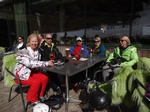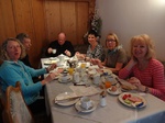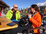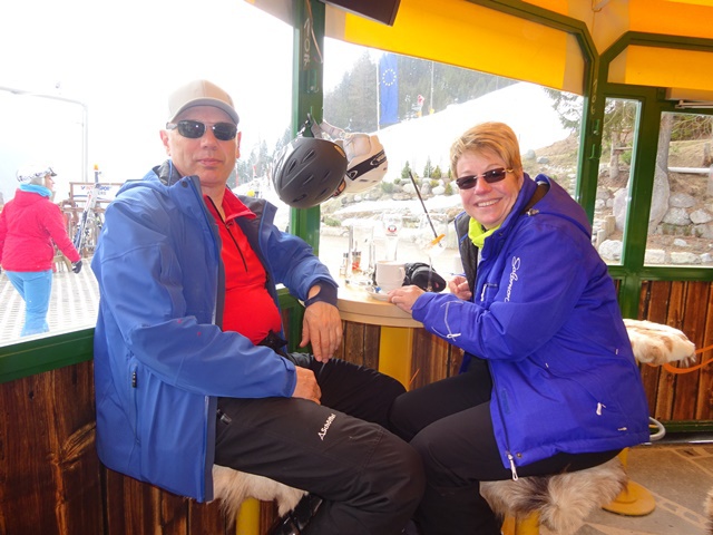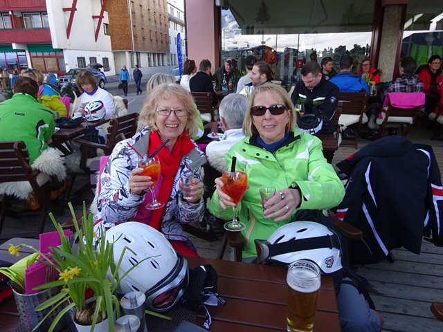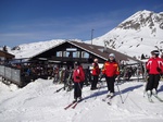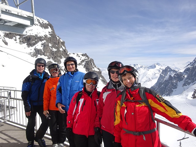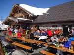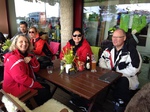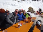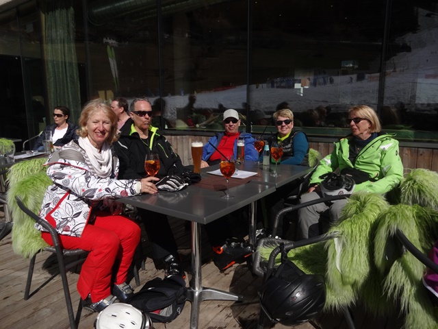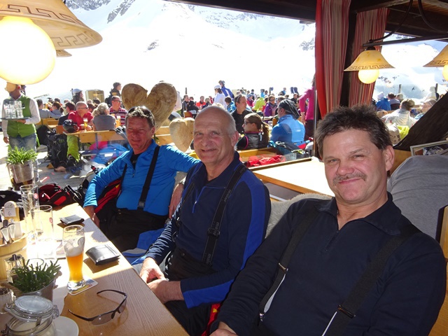 Es war der wärmste Tag dieser Ausfahrt. Trotzdem hatten wir bis zur Mittagszeit noch sehr guten Schnee- und Pistenbedingungen. Da der Schnee weicher und Skifahren immer schweißtreibender wurde, sammelten sich doch nach und nach immer mehr aus unserer Gruppe im Cafe direkt an der Trittkopfbahn um den