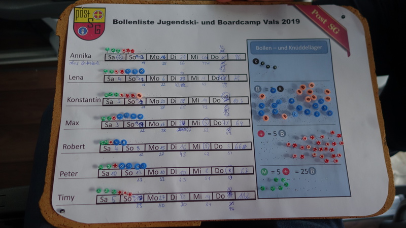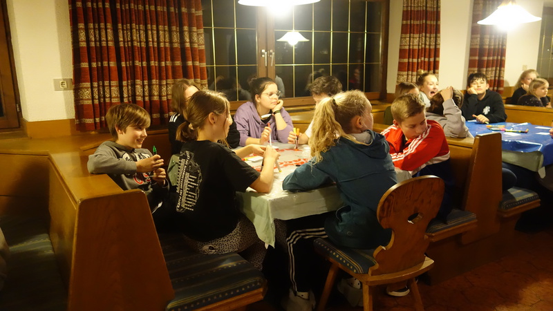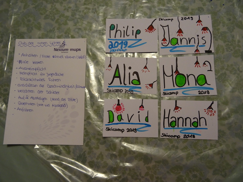 Am ersten Tag haben wir nach 10 Stunden Fahrt Spaghetti gegessen und wurden danach für die Miniolympiade in Gruppen eingeteilt. In den Gruppen mussten wir dann Namensschilder malen und die Fis-Regeln aufschreiben, zu welchen wir vorher einen Film angeschaut hatten.