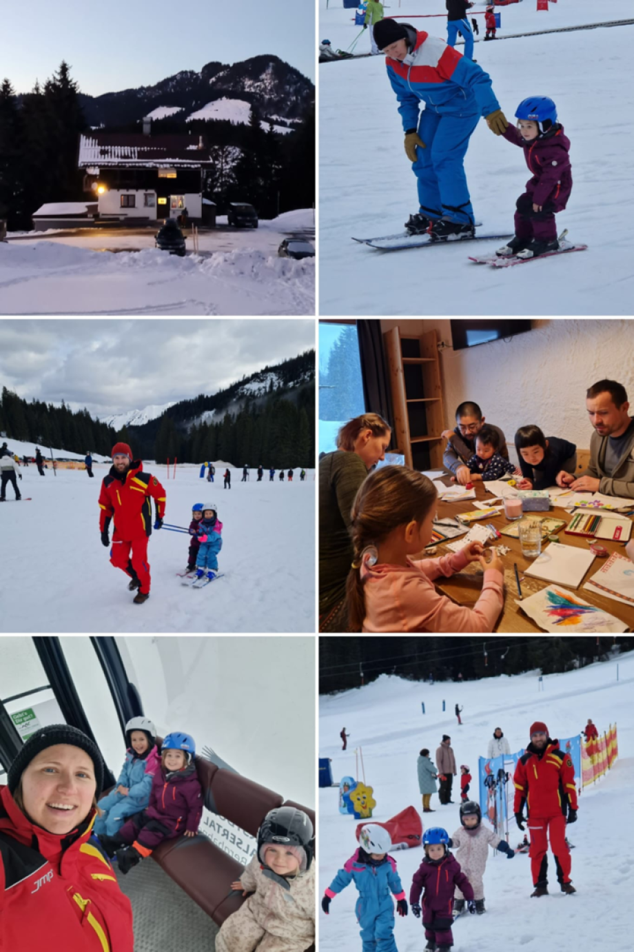 Der erste Nachmittag wurde von den Kindern direkt genutzt um das Haus unsicher zu machen. Die umliegenden Hänge wurden bestiegen und in eine Rodel- und Rutschbahn verwandelt. Am nächsten Tag sind wir zur Ifen Winterwelt gefahren und es ging ab auf die Ski. Zum ersten Mal für die meisten Kinder. Die Gewöhnung an den Schnee und die rutschigen Ski gelang schnell, sodass erste eigene Abfahrten möglich waren und auch der Zauberteppich für die Fahrt nach oben für Spaß gesorgt hat. An den folgenden Tagen trainierten wir abwechselnd Ski und Rodel fahren, bauten Schneemänner und Schanzen in den Pausen und verbrachten den zweiten Tag am Fuße des Walmendinger Horns.