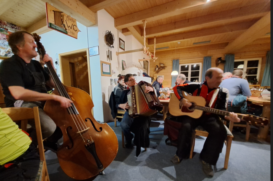 Die Buslenkzeit konnte somit nicht mehr eingehalten werden. Also traf sich die ganze Gruppe im Gasthaus Faistenoy um die Zeit bis zur neuen geplanten Abfahrt 19:15 Uhr zu überbrücken. Nach dem alle mit Getränken und Essen versorgt waren, entdeckte Peter eine Gitarre und stimmte mit einigen Gesangsfreunden einige Lieder an. Daraufhin holte der Wirt seinen Kontrabass hervor und ein weiterer Mitarbeiter seine Ziehharmonika. Als Trio machten sie nun zusammen Hausmusik die bei allen Gästen bestens ankam. So verging die Zeit wie im Fluge bei dieser „alten Art“ des Apre´s Ski. Mit guter Stimmung traten wir nun die Heimfahrt an, Auch wenn es etwas später als geplant wurde.